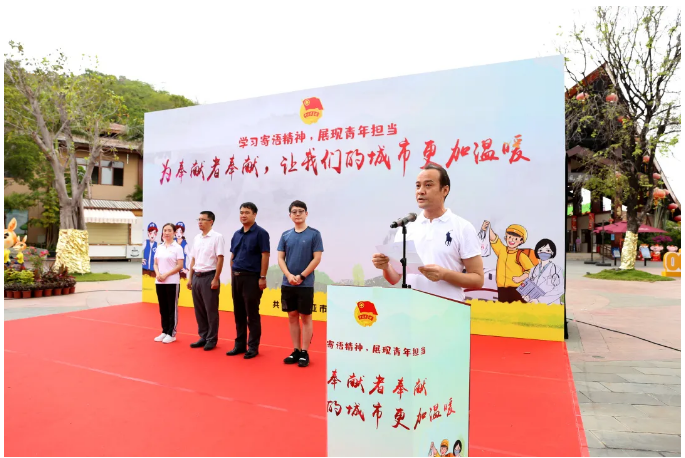 华侨城(海南)集团助理总经理、三亚鹿回头旅游开展有限公司总经理赵传建代表鹿回头风景区致辞。在致辞中表示,作为三亚市属国有企业,旅文集团坚决贯彻习近平总书记关于打赢新冠肺炎疫情阻击战的重要指示精神,第一时间以战斗姿态投入疫情防控,在疫情面前持续贡献国资企业力量,展现国企担当。与此同时,我们也将组织公司党员、团员参加此次活动,充分培育和践行社会主义核心价值观,大力弘扬奉献、友爱、互助、进步的志愿服务精神,展现我们青年奉献者的风采和精神面貌,以更饱满的热情和更加昂扬的斗志投身到三亚文化旅游事业中。
