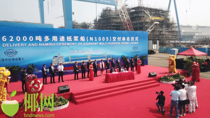 7月15日上午,中远海运62000吨多用途纸浆船N1005交付命名仪式在大连举行。这是继6月12日首艘“中国洋浦港”船籍港货轮“中远海运兴旺”交付使用后,第二艘注册在“中国洋浦港”的船舶,该轮命名为“中远海运鹏程”轮,当天它将开始首航,前往珠海装载纸浆厂设备运往南美巴西。